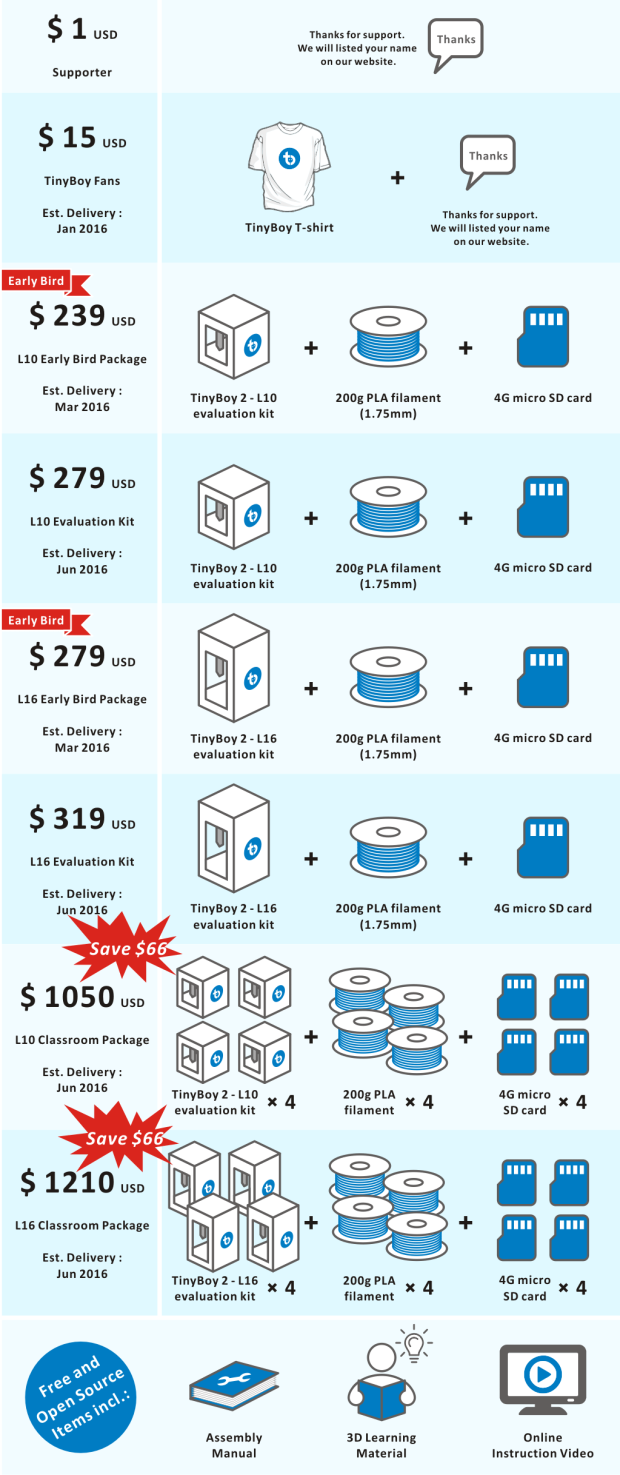 If you don't need a 3D printer but would like to support us, you could be our $1 supporter or buy our $15 Tinyboy T-shirt.